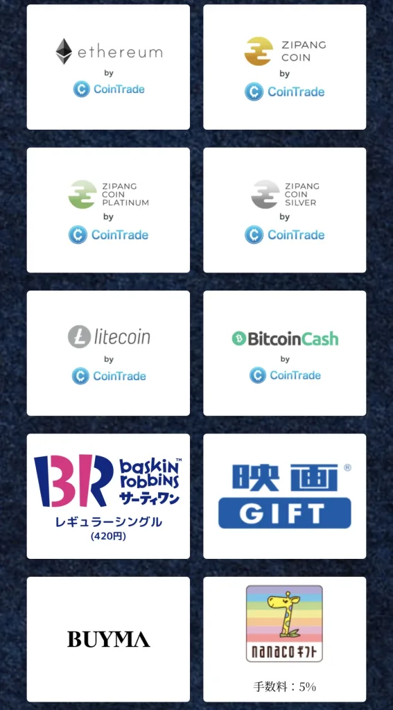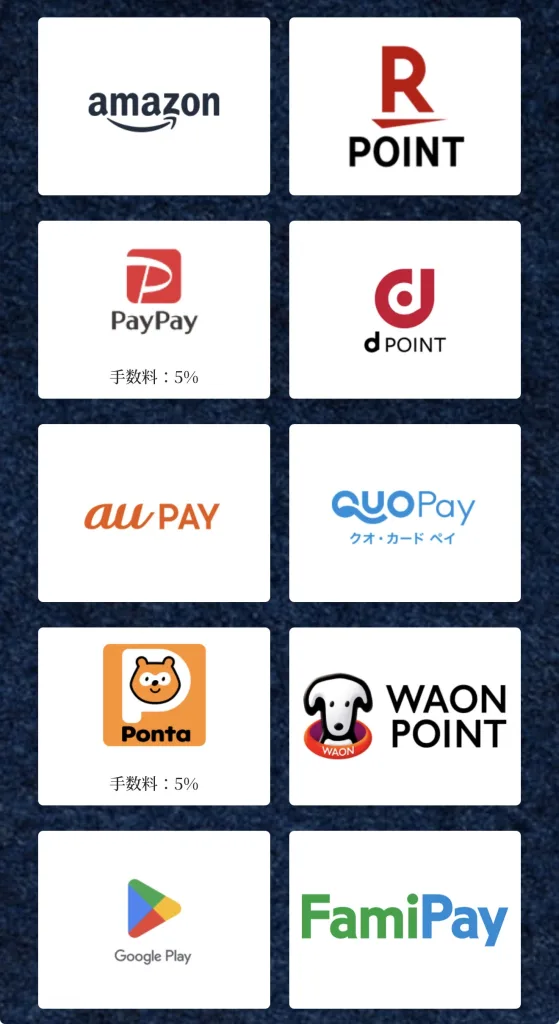 Ponta:Pontaポイント(※画像下部に「手数料:5%」との記載があります)