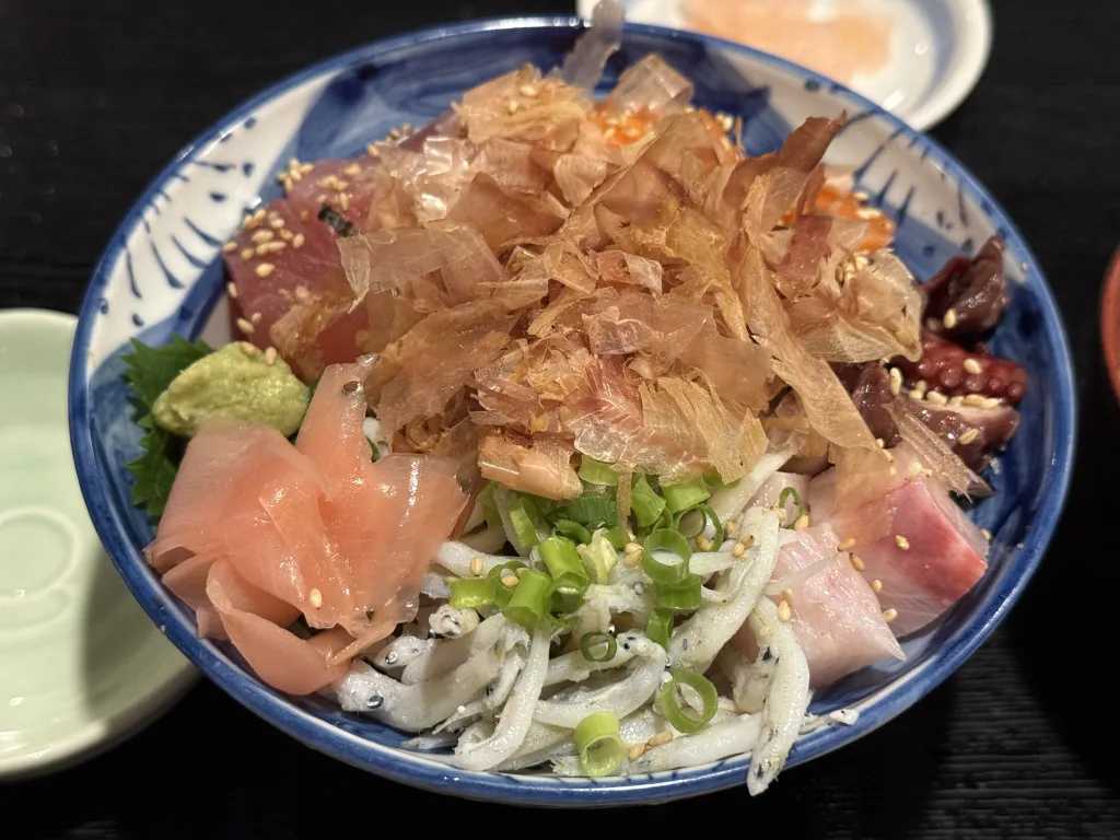 これは美味しそうですね。確かにぶつ切りの刺身が入っていますね。鰹節も美味しいですね。お店で削ったのかな。しらすも美味しいです。内容はお値段以上でした。ちなみにご飯は大盛りにしています。